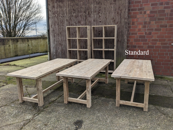 Die Platten bei den Bauholztischen sind mittels Querleisten verschraubt. Diese Tische sind auch für den Außenbereich geeignet.