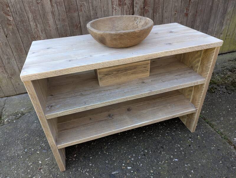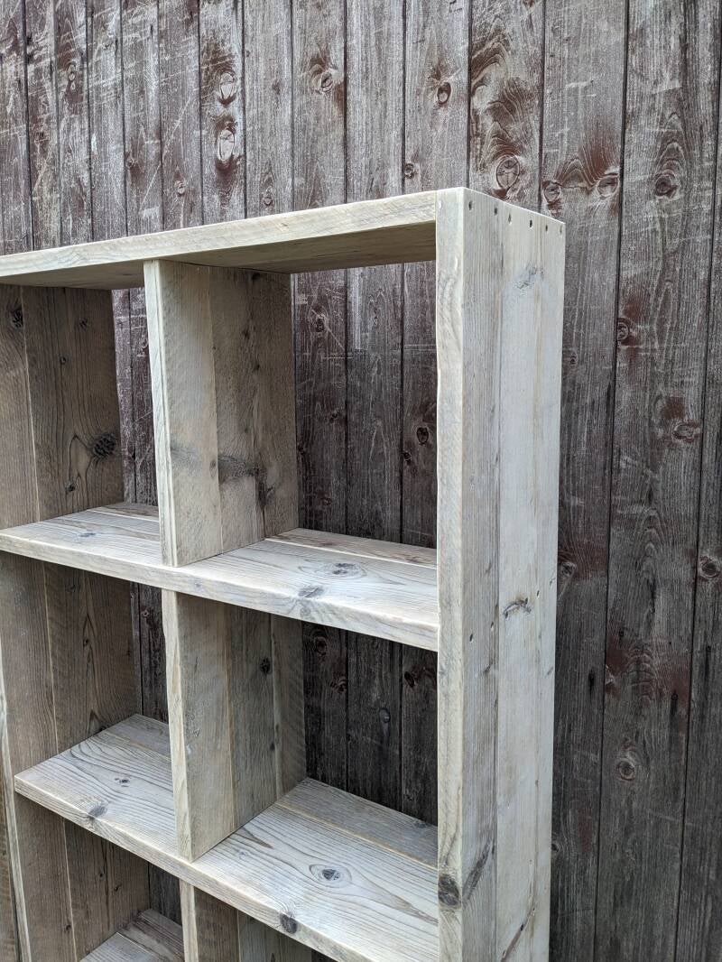 Dieses Regal ist aus gebrauchten Gerüstbohlen gefertigt. Mit Türen, Schubladen, anderer Aufteilung oder ein anderes Format, alles auf Anfrage möglich. Hier sind die Fächer 400 x 400 mm, die Gesamthöhe 1810mm.